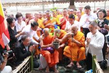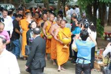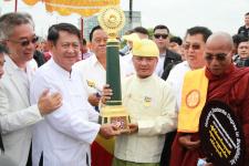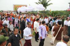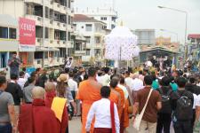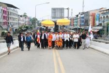 วันที่ 31 พฤษภาคม 2560 เวลา 06.30 น. นายสุทธา สายวาณิชย์ รองผู้ว่าราชการจังหวัดตาก เจ้าคณะจังหวัดตาก พร้อมหัวหน้าส่วนราชการ ภาคเอกชน และประชาชนในอำเภอแม่สอด ให้การต้อนรับ คณะธรรมยาตรา 5 แผ่นดิน ตามรอยพระอริยสงฆ์ลุ่มน้ำโขง นำโดยพระธรรมวรนายก ที่ปรึกษาเจ้าคณะจังหวัดนครราชสีมา พระธรรมโพธิวงศ์ (วีรยุทโธ) หัวหน้าพระธรรมทูตไทยสายอินเดีย เนปาล เจ้าอาวาสวัดไทยพุทธคยา รัฐพิหาร อินเดีย และพระธรรมทูต จาก 5 ประเทศ ประกอบด้วย ไทย ลาว กัมพูชา เวียดนาม เมียนมา จำนวน 72 รูป ได้เดินทางมาถึงวัดโพธิคุณ ต.แม่ปะ อ.แม่สอด จ.ตาก โดยช่วงเช้าได้มีกิจกรรมตักบาตร พร้อมทำพิธีปลูกต้นพระศรีมหาโพธิ์ จากนั้นคณะได้เดินทางไปยังที่ด่านพรมแดน สะพานมิตรภาพ ไทย-เมียนมา แห่งที่ 1 อ.แม่สอด จ.ตาก เพื่อทำพิธีส่งมอบตราสัญลักษณ์ ส่งมอบธงฉัพพรรณรังสี พร้อมทั้งส่งมอบธงธรรมยาตรา และส่งมอบเสาเสมาธรรมจักร ให้กับคณะจากประเทศเมียนมา โดยมี อู คิน ซุ่ย ประธานคณะกรรมการฝ่ายการดูแลศาสนาพุทธ ประเทศเมียนมา เป็นผู้รับมอบ พร้อมมีผู้แทนจากรัฐกระเหรี่ยง ผู้ว่าราชการจังหวัดเมียวดี หัวหน้าส่วนราชการและประชาชนในจังหวัดเมียวดี เดินทางมาร่วมพิธีส่งมอบโดยพร้อมเพียง