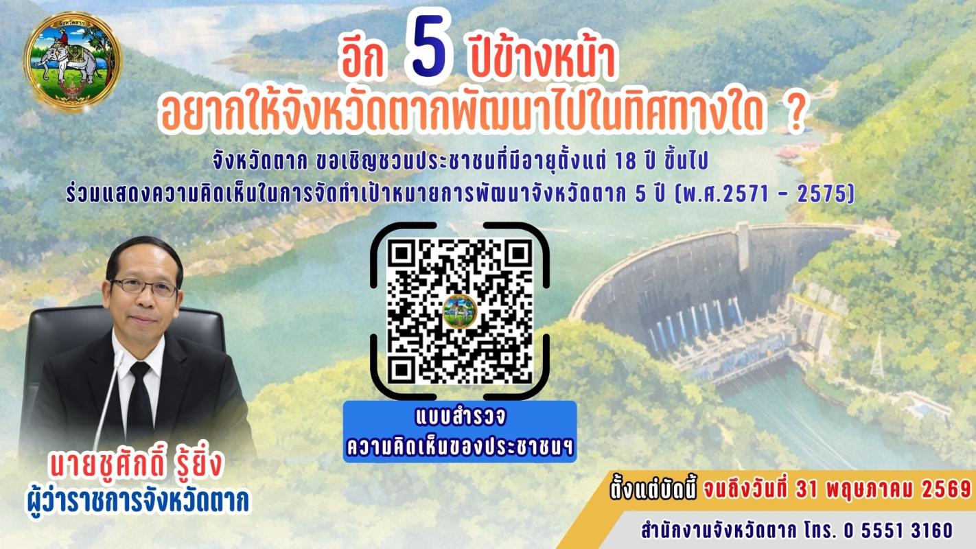 อีก 5 ปีข้างหน้า อยากให้จังหวัดตากพัฒนาไปในทิศทางใด จังหวัดตาก ขอเชิญชวน ประชาชนทั่วไป ร่วมแสดงความคิดเห็น ผ่านแบบสำรวจออนไลน์ เพื่อนำไปจัดทำ *เป้าหมายการพัฒนาจังหวัดตาก 5 ปี (พ.ศ.2571 - 2575)*