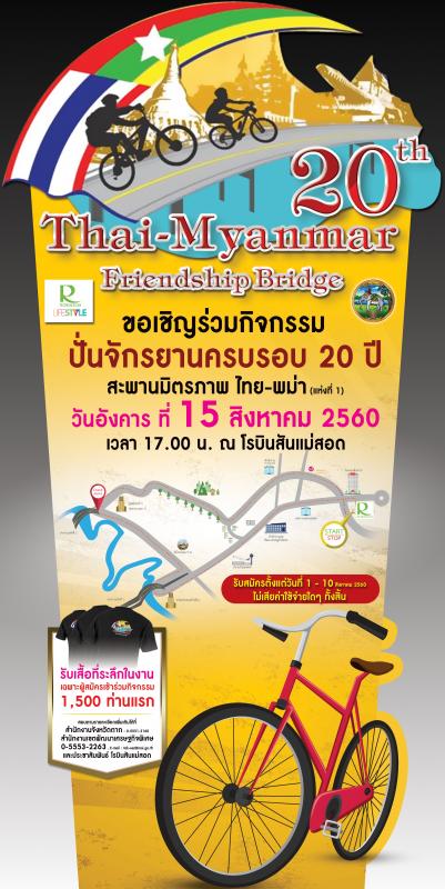 จังหวัดตาก ขอเชิญร่วมกิจกรรมปั่นจักรยานครบรอบ 20 ปี สะพานมิตรภาพ ไทย - พม่า (แห่งที่ 1) ในวันที่ 15 สิงหาคม 2560 เวลา 17.00 น. ณ บริเวณโรบินสันแม่สอด อ.แม่สอด จ.ตาก